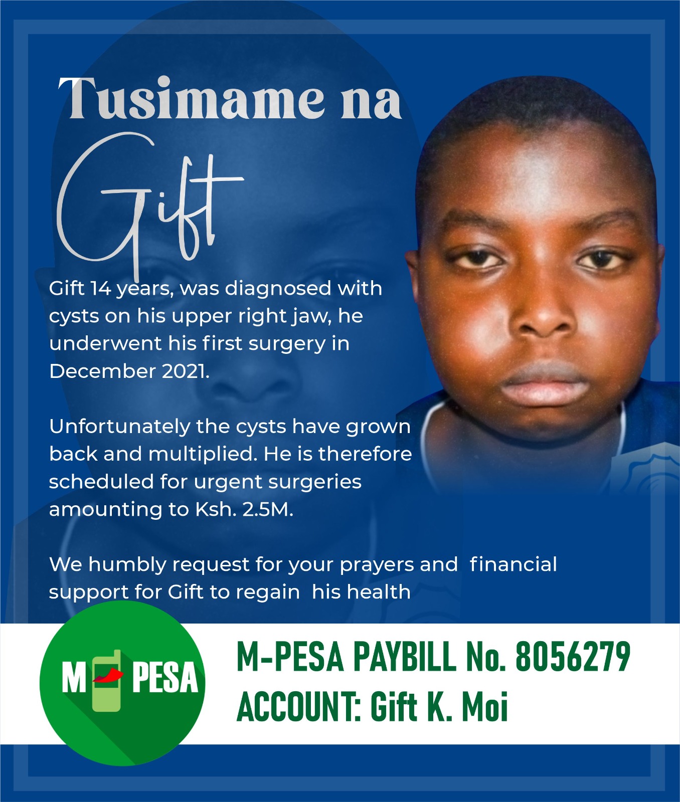 He said this has led his mother to resort to creating a paybill number to raise funds for the surgery.