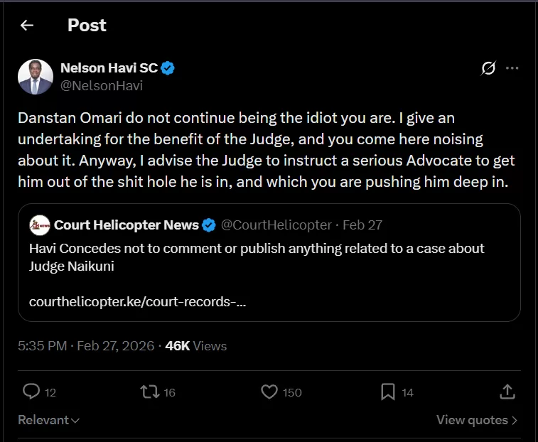 Through the lawyer Shadrack Wambui, Omari accuses Havi of publishing offensive remarks on 27th February 2026 at 5:35 p.m. via his official X account under the username Nelson Havi.